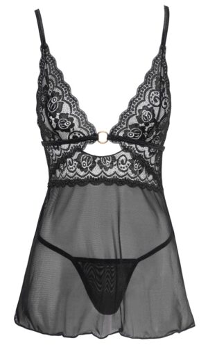 Verführerisch verspielte Transparenz! Kurzes Babydoll von Cottelli LINGERIE aus elastischem feinem Powernet mit Spitzen-Cups, die von einem goldfarbenem Ring zusammengehalten werden. Unterbrustband und Träger verbinden sich im Rücken ebenfalls mit einem goldfarbenen Ring. Träger verstellbar. Inklusive schlichter String aus Powernet. 90% Polyamid, 10% Elasthan.