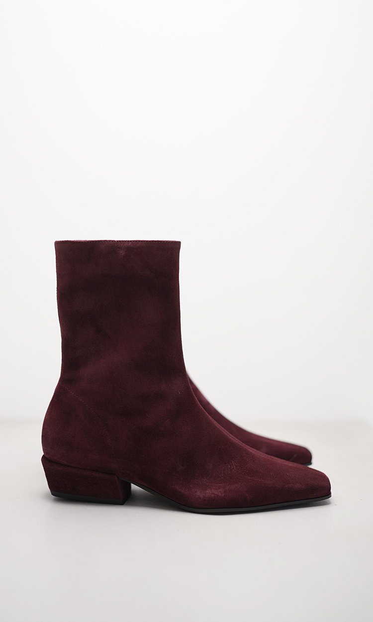Minimalistisch im Design, maximal in der Wirkung: Dieser edle Bootie begeistert mit seiner klaren Linienführung und dem hochwertigen Veloursleder in einem satten Bordeaux-Ton. Die schmale Silhouette mit leicht abgeschrägtem Blockabsatz verleiht dem Modell eine feminine Note, während der bequeme Schnitt für hohen Tragekomfort sorgt. Ob zur schmalen Denim, zur weiten Stoffhose oder zum Midirock – dieser Bootie setzt stilvolle Akzente und rundet jedes Herbst/Winter-Outfit mit dezenter Raffinesse ab.