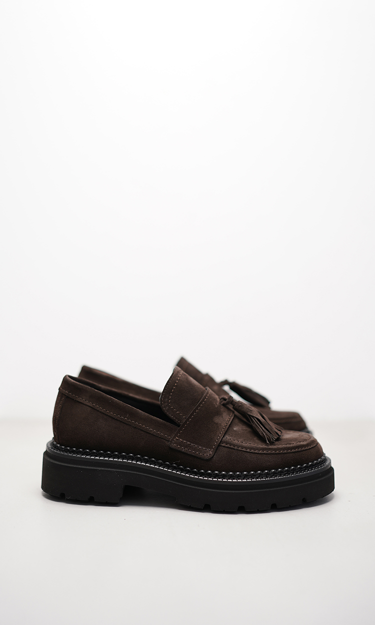 Lässig und stilvoll zugleich: Dieser JACY Loafer überzeugt mit einem sportiven Look und feiner Verarbeitung. Aus softem Veloursleder in einem satten Dunkelbraun gefertigt, wirkt der Schuh besonders edel und zugleich entspannt – ideal für stilbewusste Alltags-Looks mit modernem Anspruch. Ein dunkelbrauner Trottel auf dem Blatt greift die Farbgebung des Leders harmonisch auf und verleiht dem Modell eine klassische, leicht verspielte Note. Die leichte Profilsohle sorgt für angenehmen Tragekomfort und verleiht dem Schuh eine dynamische, zeitgemäße Silhouette. Ob zur Stoffhose oder zur lässigen Denim – dieser Loafer ist ein vielseitiger Allrounder für jeden Tag und vereint Eleganz mit sportlicher Lässigkeit.