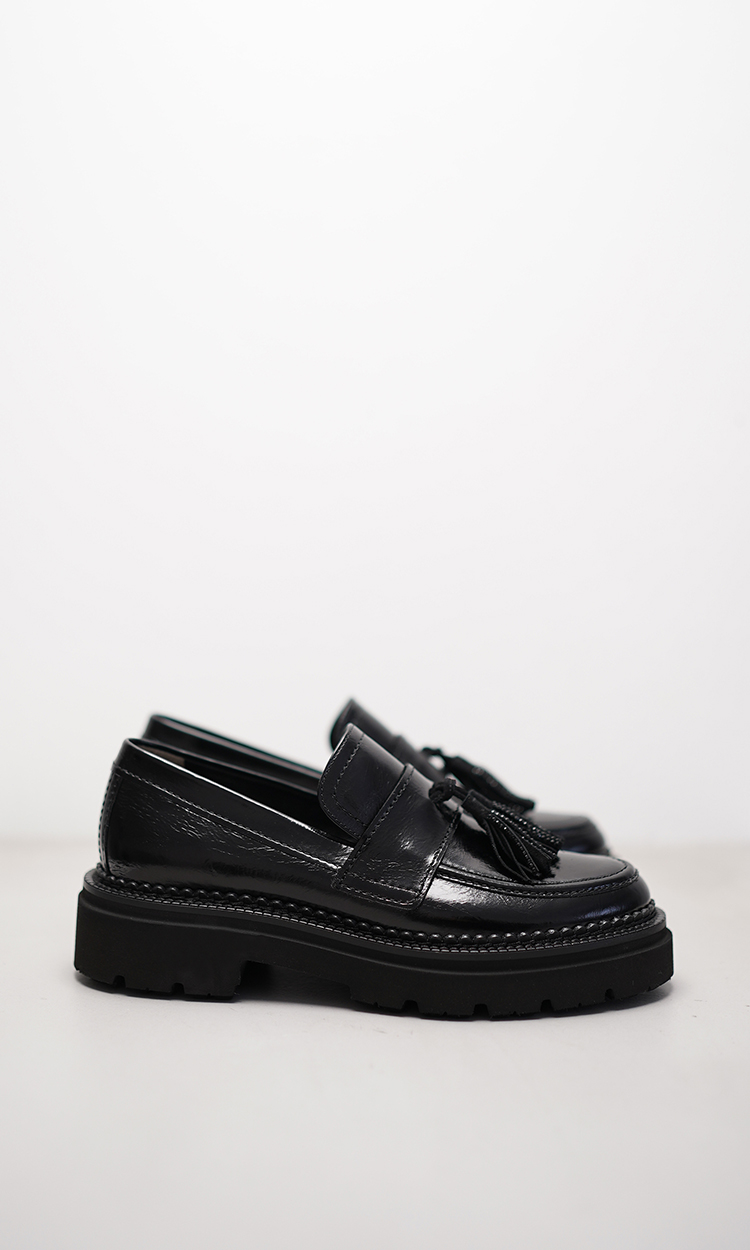 Klassische Eleganz trifft auf modernen Style: Dieser edle JACY Loafer überzeugt mit einem stilvollen Mix aus Tradition und Trend. Gefertigt aus hochwertigem, geprägtem Glattleder in tiefschwarzer Farbe, strahlt das Modell eine dezente, fast glänzende Noblesse aus. Die strukturierte Oberfläche verleiht dem Schuh eine raffinierte Tiefe und unterstreicht seine Exklusivität. Ein besonderer Blickfang ist der schwarze Trottel am Blatt – ein dekoratives Element, das dem Loafer einen Hauch von verspielter Raffinesse verleiht, ohne die klassische Linie zu stören. Die rustikale Profilsohle sorgt nicht nur für optimalen Halt und Komfort, sondern setzt auch einen modischen Kontrast zum eleganten Obermaterial. Ob im Büro oder in der Freizeit – dieser Loafer ist ein stilvoller Begleiter mit Charakter. Ein echtes Statement für alle, die Wert auf Qualität, Design und Individualität legen.