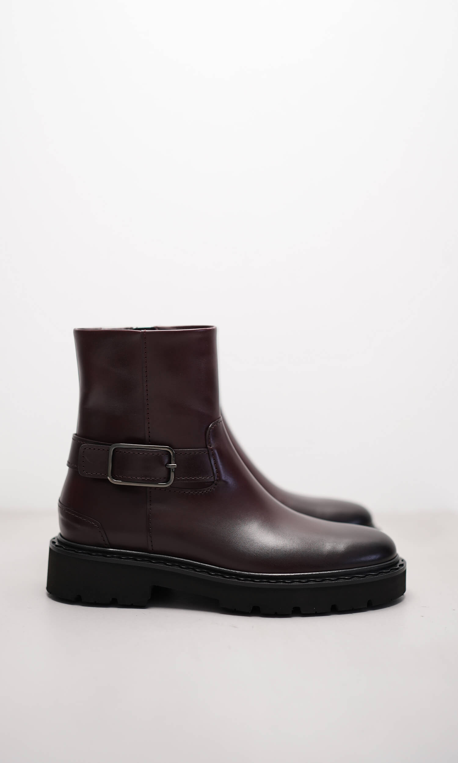 Dieser elegante Ankle Boot aus bordeauxfarbenem Kalbleder kombiniert schlichte Form mit besonderem Farbstatement. Das warme Bordeaux verleiht dem minimalistischen Design Tiefe und Raffinesse, während das dezente Schnallen-Detail am Schaft einen stilvollen Akzent setzt. Die robuste Profilsohle sorgt für Bodenhaftung, ein seitlicher Reißverschluss erleichtert das Anziehen. Ein vielseitiger Begleiter für stilbewusste Looks – von urban bis elegant.