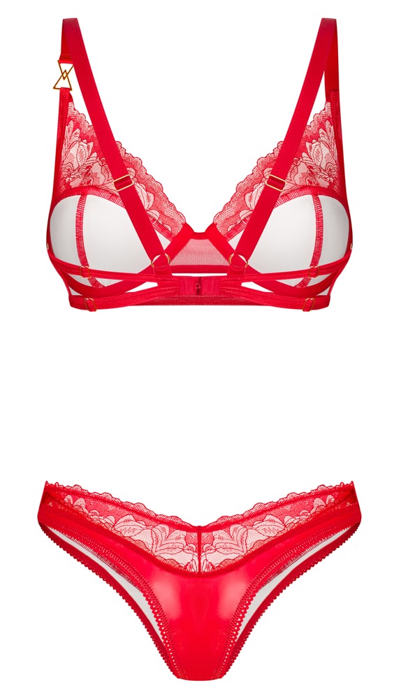 Sinnliches Rot mit Glanz und Spitze! Set Aliosa von Obsessive mit Bügel-BH und Riostring. Verführerischer Style in sinnlichem Rot mit edlem glatten Glanz und feiner transparenter Floral-Spitze. Rundum weich und elastisch für hohen Tragekomfort. BH mit dezentem goldfarbenen Schmuckdetail zwischen den Bügel-Cups und an einem Träger. Die Träger und der Hakenverschluss im Rücken sind passend verstellbar. 90% Polyamid, 10% Elasthan, mit Polyurethan-Beschichtung. Achtung – Obsessive hat eine separate Größentabelle.
