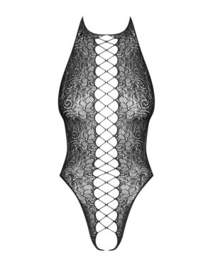 Verführerisch von vorne und hinten! Schwarzer Neckholder-Body ouvert B113 von Obsessive in gewebter Spitzenoptik mit Grobnetzstreifen in der Front. Rundum weich und elastisch für hohen Tragekomfort. Knapp geschnitten und im Schritt bis über den Po verführerisch offen. 90% Polyamid, 10% Elasthan. ACHTUNG – Obsessive hat eine separate Größentabelle!