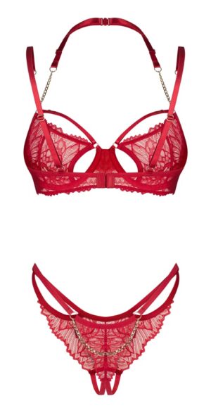 Elegantes Rot mit Kettchen und Spitze! Set Matildea von Obsessive mit Bügel-BH und Riostring ouvert. Verführerischer Style in tiefem Rot mit feiner Spitze und goldfarbenen Schmuckdetails. Weich und elastisch für hohen Tragekomfort. Bügel-BH mit Kettchen an den verstellbaren Trägern und am dekorativen, verstell- und abnehmbarem Neckholder. Auch die oberen Cup-Riemchen sind passend verstellbar. Der schrittoffene Riostring verführt mit einem Kettchen über dem Po und kleinem Schmuckdetail in der Front. 90% Polyamid, 10% Elasthan. Achtung – Obsessive hat eine separate Größentabelle.