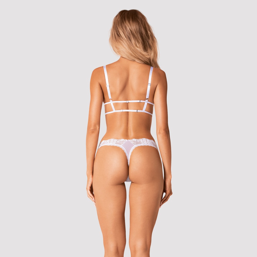 Romantik-Look mit Blütenspitze! Set Heavenlly von Obsessive mit Soft-BH und String. Aus weißem Feinnetz und Ton in Ton mit bildschöner Blütenspitze in verführerische Szene gesetzt. Rundum weich und elastisch für hohen Tragekomfort. Länger geschnittener Soft-BH mit zwei Hakenverschlüssen im Rücken, die genauso verstellbar sind wie die Träger. 90% Polyamid, 10% Elasthan. Achtung – Obsessive hat eine separate Größentabelle.