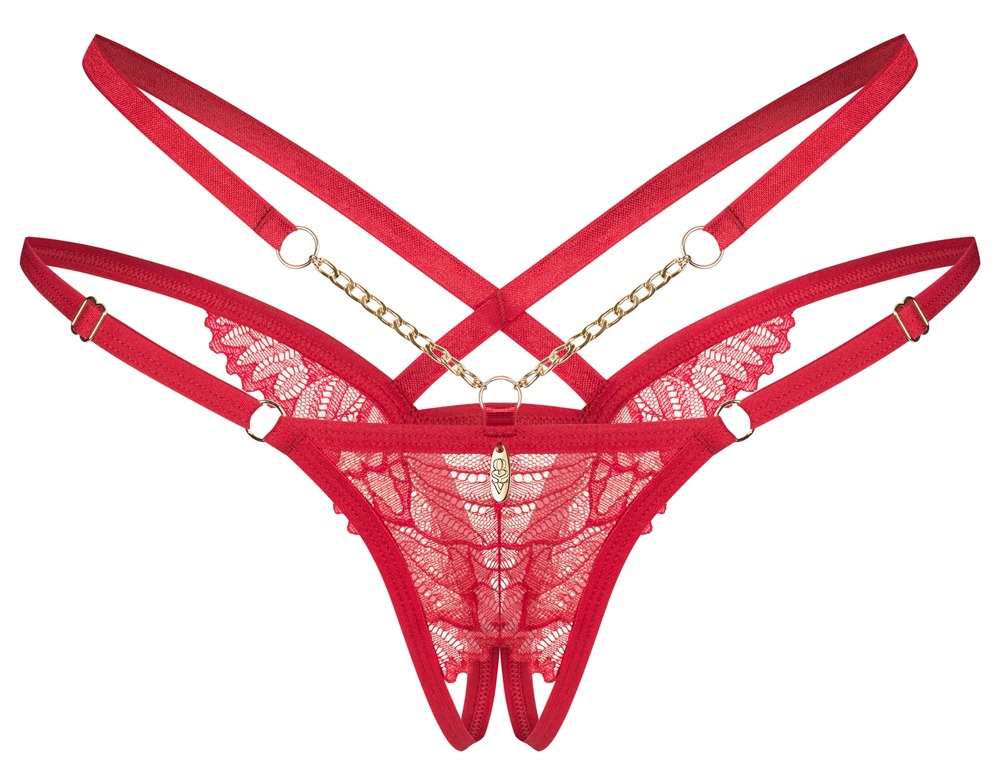 Luxuriöser Style aufregend ouvert! Riostring ouvert Matildea von Obsessive im eleganten Riemenstyle. In tiefem Rot mit feiner Spitze und goldfarbenen Details. Weich und elastisch für hohen Tragekomfort. 2 Kettchen und ein kleines Schmuckelement zieren die Front. Der untere String-Riemenbund ist passend verstellbar. Im Schritt verführerisch offen. 90% Polyamid, 10% Elasthan. ACHTUNG – Obsessive hat eine separate Größentabelle!