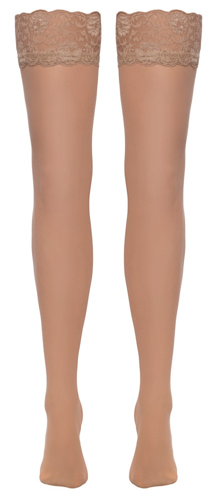 Setzt Beine elegant in Szene! Nudefarbene, seidige Strümpfe von Cottelli LEGWARE mit elastischem, 9 cm breitem Spitzen-Abschluss. Garnstärke 20 den. Oeko-Tex zertifiziert. 80% Polyamid, 20% Elasthan. Änderung der Spitze vorbehalten.