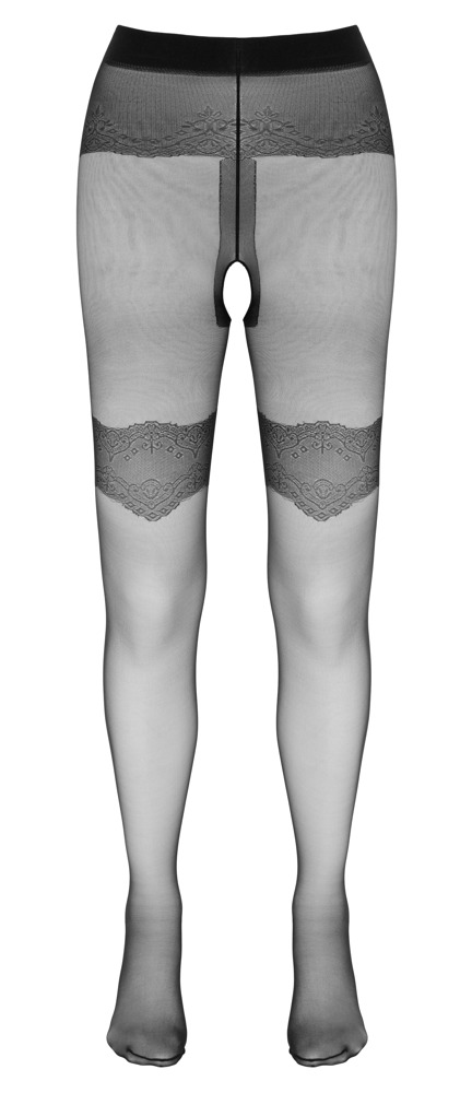Unverschämt sexy! Seidige Straps-Strumpfhose von Cottelli LEGWEAR mit eingewebten Strumpfbändern und Ziernähte hinten. Dazu ist der Schritt ist einladend offen. 88% Polyamid, 12% Elasthan.